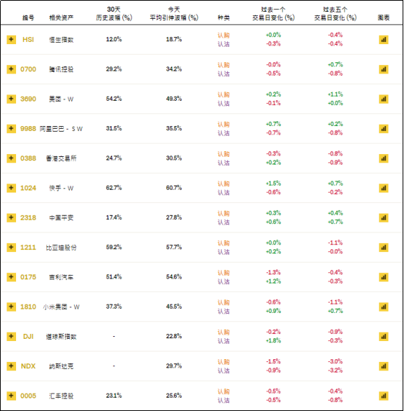 周四恒指相关权证的平均引伸波幅报约18.7%。个股方面,快手、阿里相关认购证的引伸波幅按日小幅调升;道琼斯、吉利、相关认沽证的引伸波幅则按日小幅调升。