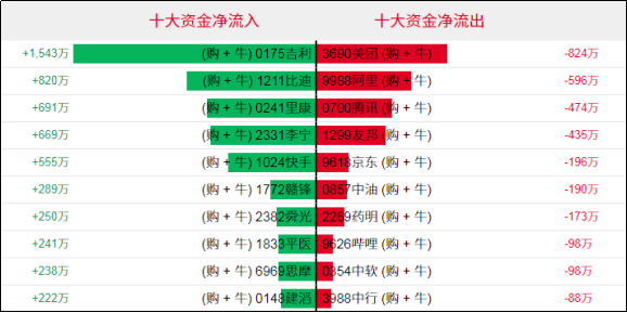 好仓(认购证及牛证)方面,周四吉利、比迪相关好仓单日分别录得约1543万、820万港元资金净流入;美团、阿里相关好仓单日分别录得约824万、596万港元资金净流出。