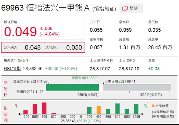 2、看错方向:恒指法兴—甲熊A(69963.HK),周四下跌14.04%。