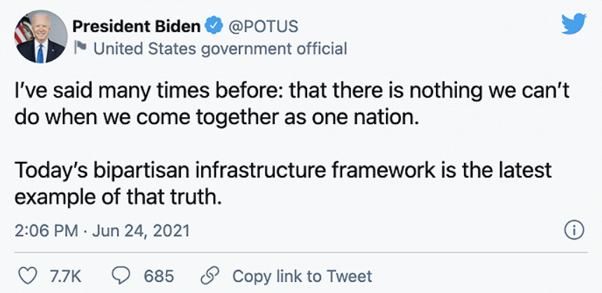 值得注意的是,拜登指出,两党议员都做出了“郑重的让步”,我们大家将在预算协调程序和协调议案中看到结果。但拜登并未提及基建方案的投入规模。