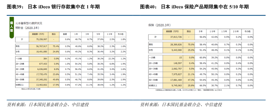 对标海外,商业养老金产品具有长久期资金+保障属性的特质,在居民养老金配置中不可或缺。具备精算支持下的养老保险产品期限,可支撑10年及以上产品的方案涉及,并兼具保障功能,具有不可替代性,如iDeco银行储蓄产品聚焦1年期(占比48.7%),而保险产品期限聚焦与5年(56.6%)、10年(42.6%)。从供给端看,养老资金具备长期投资的诉求,保险公司、保险资产管理公司或养老金管理公司具备长期资金投资运营经验,天然具备长久期资产的安全性、流动性、收益性运作经验。