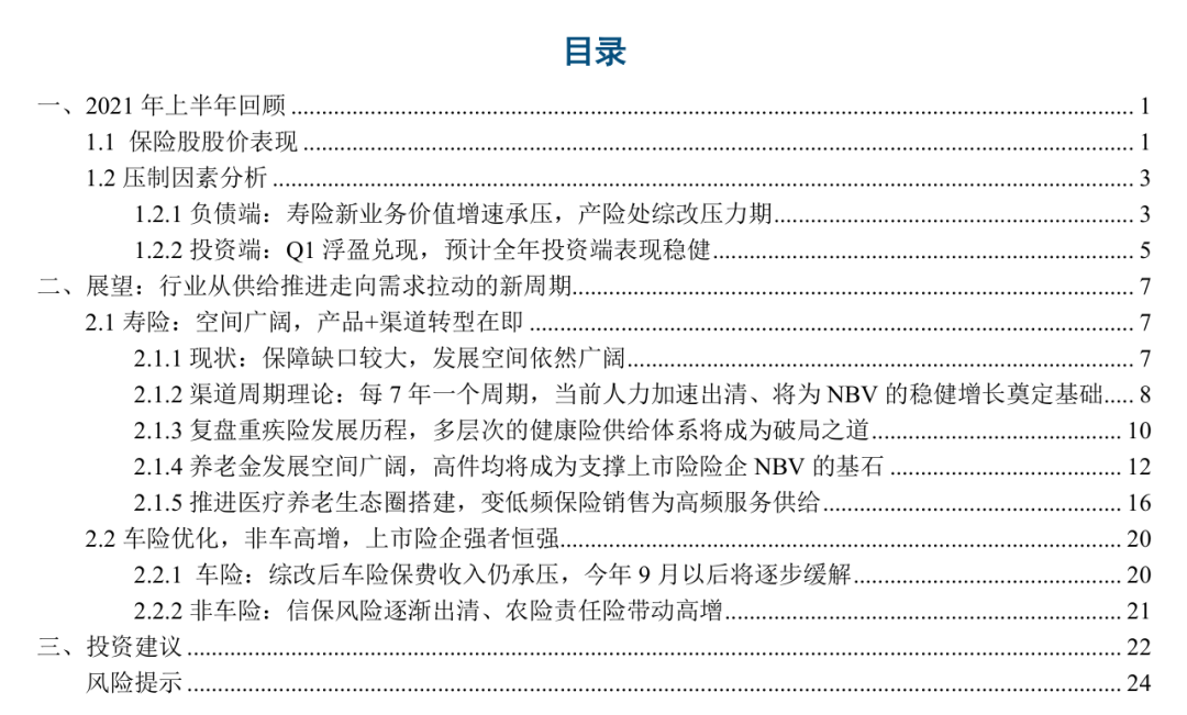 无论是寿险还是财险,在迈向高质量发展的新周期下,均开启从“供给推动”向“需求拉动”型的行业升级转型中。上市险企寿险业务短暂承压,下半年受基数效应影响,缺口将有所收窄。而行业长期增长的长逻辑:医疗、养老需求缺口依然较大。人口七普数据显示,我国老龄化问题凸出、养老金市场有待开发。而在资管刚兑打破背景下,行业迎来财富管理大发展的机遇,具备长久期、确定性、稳健性的储蓄类年金产品有望进一步迎合居民资产配置的需求。而在养老金替代率不足、缺口持续拉大的冲击下,第三支柱养老保险市场的打开将进一步助力上市险企建立NBV的坚实壁垒。虽然我国医疗险市场主要受社保影响较大,但重大疾病的医疗费用较高而社保补偿功能仍存天花板,且个人自付部分的金额依然较重;考虑到收入补偿、康复支持等因素的影响,当前重疾险发展依然有需求的支撑。但随着市场认知的提升,多层次的商业医疗险产品将逐步推出,共同做大健康险市场的蛋糕。上市险企短期受人力增员的影响,新单增速承压,但在广阔的医疗、养老险赛道上,仍将持续收益。率先改革取得渠道分层化改革成果、以及多样化产品推荐市场的险企,将率先建立稳固的NBV增速壁垒。财险业务在加速出清的车险市场加持下,将愈加强者恒强。