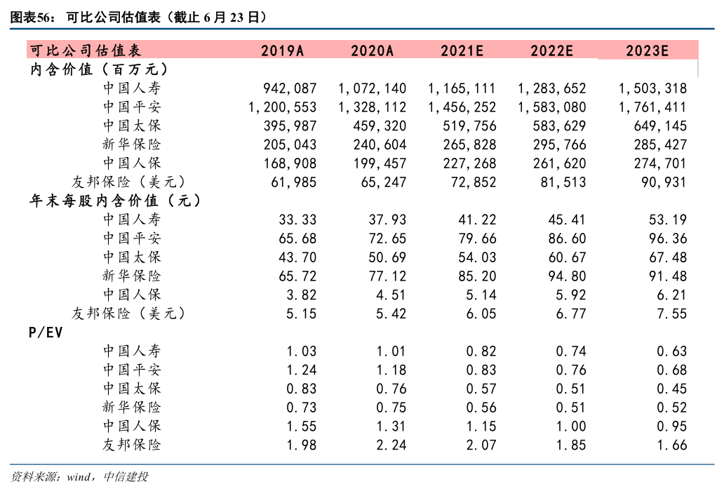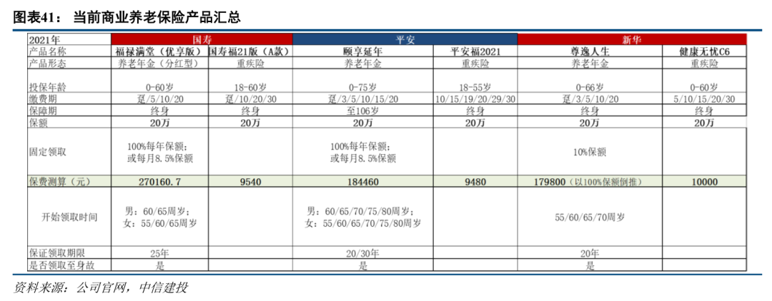 商业养老保险件均较高,打平重疾险的新业务价值率仅需3.5%-4.5%。目前规模最大的年金险均为开门红系列产品,养老年金较少、新单规模有待提升。而真正的养老年金均为具备保证给付期限(如:20年、25年、30年等)、且领取时间在55岁以上的产品,意味着年金险的储蓄期较长。虽然从精算角度看,因养老年金对利差依赖度远高于重疾险(含死差、费差等发生率假设),决定了该类产品的新业务价值率低于重疾险,但养老年金的件均保费基本等同于保额(即养老领取期的领取额),以2021年20万保额的新推养老金产品测算,纯粹的养老年金是重疾险保费的20倍。而主流重疾险新业务价值率约70-90%,保持当前NBV不变,仅需3.5%-4.5%的新业务价值率即可打平 。商业养老险市场的打开,将为上市险企NBV增速奠定基础。而按照当前主流增额终身寿产品形态(与养老金类似)的储蓄类产品,其价值率约20%左右,预估商业养老金产品受益于缴费及积累期的长期性,价值率应在30-40%之间。在件均保费高于重疾险的情况下,将推高上市险企NBV增速。