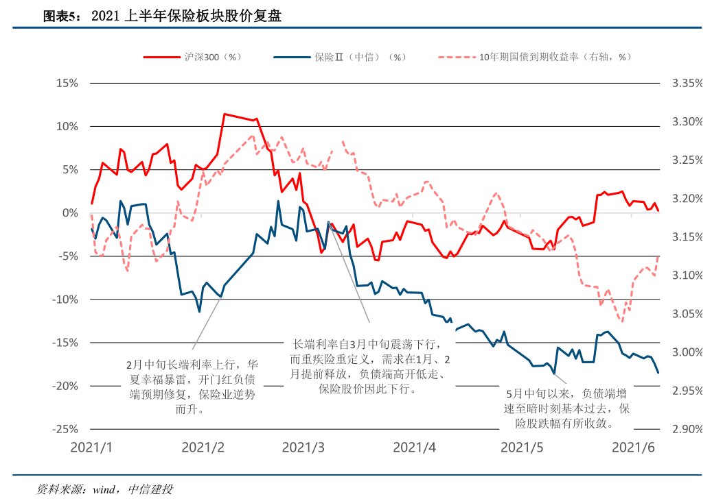 2021年上半年,保险行业整体表现不及大盘,主要受负债端保费增长乏力的影响,投资端整体稳中向好。未来板块股价走势将主要与负债端能否成功度过转型期相关。