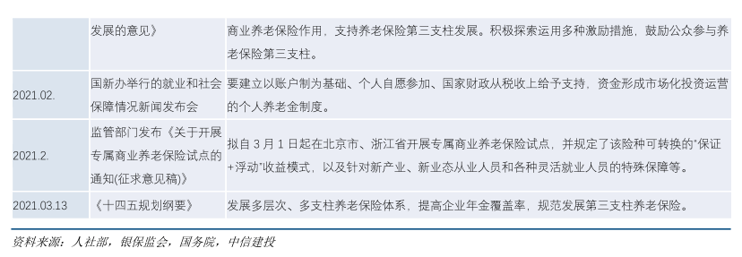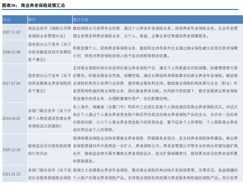 国家密集发布商业养老保险相关政策,提供政策支持。2020年下半年开始,监管和多部门频繁释放政策信号,强调将推动保险业加快发展商业养老保险,积极服务多层次、多支柱养老保险体系建设。2021年6月1日起将开展专属商业养老保险试点,养老保险第三支柱建设持续推进,商业养老保险市场呈现一片蓝海。