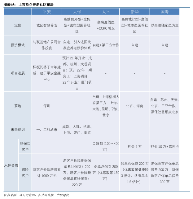 发力养老社区,打造养老服务闭环。1)平安:2021年5月9日,中国平安发布“平安臻颐年”康养品牌及旗下首个高端产品线 “颐年城”,通过整合公司金融、医疗与科技领域的优势资源发展“金融+医疗+康养”结合的新模式,首期超高端旗舰康养项目将落子深圳。未来平安将优先聚焦一线城市及部分核心二线城市的核心区位项目,建设市中心CCRC(持续照料退休社区)综合康养社区。2)太保:通过细分养老市场,打造覆盖从 55-100 岁的全年龄段养老社区产品,包括乐养、颐养、康养三大产品线。A.度假型国际乐养社区:以“旅居养老”为核心的乐养社区是太保家园为55-69岁的低龄活力长者定制的产品。长者可根据寒暑变化,自行或携家人前往太保家园位于度假胜地或宜居城市的乐养社区,享受星级酒店的服务,享受欧洲专业的非药物健康管理、身心调理等增值、特色服务;B. 城郊型国际颐养社区:引进国际标准的持续照料退休社区模式(CCRC),为70-79岁的中龄老人提供高品质的集自理、介助、介护一体化的居住设施和精细化的综合服务;C. 城市型国际康养社区:太保家园在城市中心区域为80岁以上的高龄长者精心打造专业化、个性化、人性化的高端养护社区。除了提供精细化的基础服务之外,还将通过以长者为中心的多学科服务团队,实施欧洲健康干预理念,运用非药物疗法、精神康复方法等解决方案,从健康管理、慢病管理、康复护理三个方面积极改善长者的生活质量。3)国寿:国寿嘉园打造“境”系列高品质养老社区。国寿嘉园系列产品主要包括“境”系列和社区颐康之家项目。1)苏州雅境项目为复合型养老社区,主要包括客养产品、长住产品和短租旅居产品三类产品,分别面向中国人寿客户、自理型或半自理型长者和短租旅居游客;2)天津乐境项目为医养结合型养老社区,包含高端养老社区与健管体检中心两大功能板块,涵盖活力生活区、专业照护区、乐境广场、健管养护中心、乐享生活汇五大功能区;3)三亚逸境项目为旅居修养型养老社区,项目规划建设全套房养生度假酒店、健康管理与康复中心、医疗健康步行街、养生别墅、养生洋房等物业类型。此外,国寿在深圳打造了社区居家养老项目——社区颐康之家。目前,国寿“境”系列养老社区已全部开业,总建筑面积超过35万平米。4)新华:新华家园涵盖高端养老公寓、旅居型养老社区及大型CCRC社区。北京莲花池尊享公寓集养老、护理、康复、医疗等功能,与新华康复医院对接、自建专业运营团队。海南博鳌乐享社区以活跃老人为主的旅居型休闲度假社区。北京延庆颐享社区是新华CCRC社区。5)太平:2014年10月太平投资兴建的首个重资产养老社区旗舰店上海“梧桐人家”养老社区项目正式开工,截止当前已建立2大项目:上海梧桐人家和三亚海棠人家康养项目。2017年,在原有重资产“梧桐人家”颐养社区项目的基础上,引入轻资产模式:与第三方养老社区合作,形成“保险业务+养老社区”的模式,并逐步搭建起全国网络布局,当前已布局上海快乐家园、云南古滇名城、宁波星健兰亭、北京当代时光里、大连一方颐景荟、保利天悦和熹会、朗和国际医养中心项目。通过轻资产先后引入的第三方养老社区有通过合作、联营的方式,逐步完善“保险产品+养老社区+养老服务”的产业链。