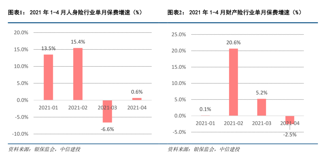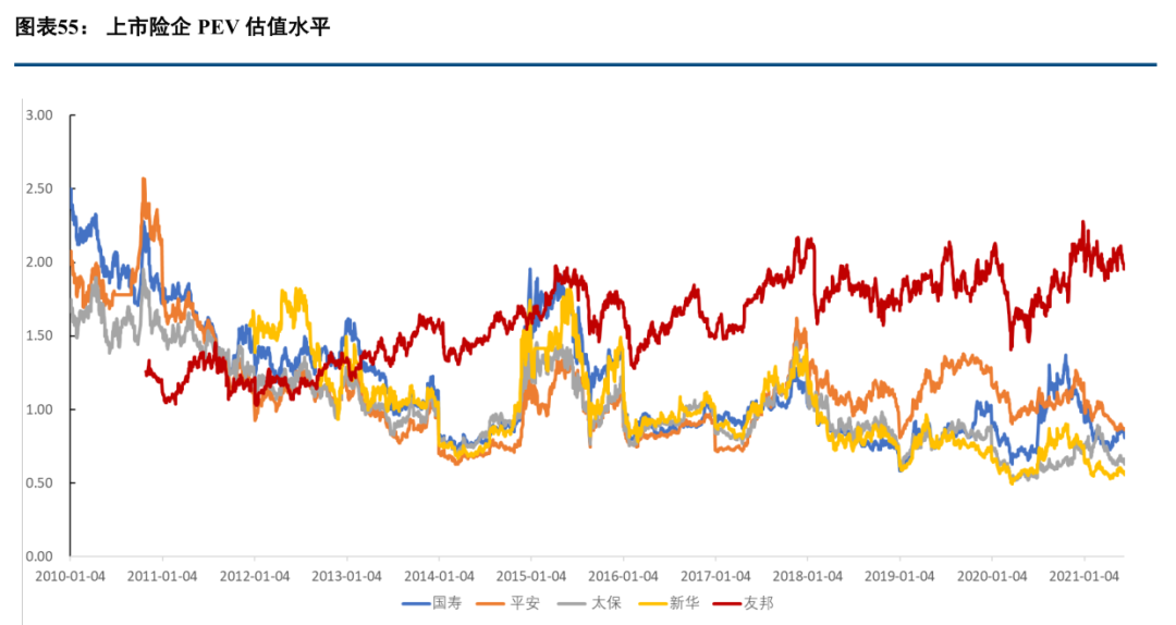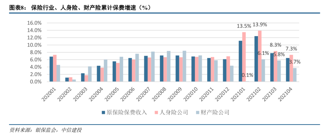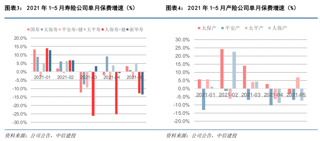 行业负债端高开低走、股价亦与之同向。今年以来,人身险行业单月保费增速自1月、2月的13.5%、15.4%降低至-6.6%、0.6%。财险行业1-4月单月保费增速分别为0.1%、20.6%、5.2%、-2.5%。上市公司的财险、寿险业务增速普遍在1-2月高增后逐步下滑,当前负债端增长压力较大。截止2021年6月11日,保险指数自年初下跌18.5%,跑输沪深300指数18.7个百分点。从沪深保险个股来看,截止2021年6月11日,人保、人寿、太保、新华和平安的累计涨跌幅分别为-8.5%、-13.3%、-15.3%、-17.4%和-18.7%。