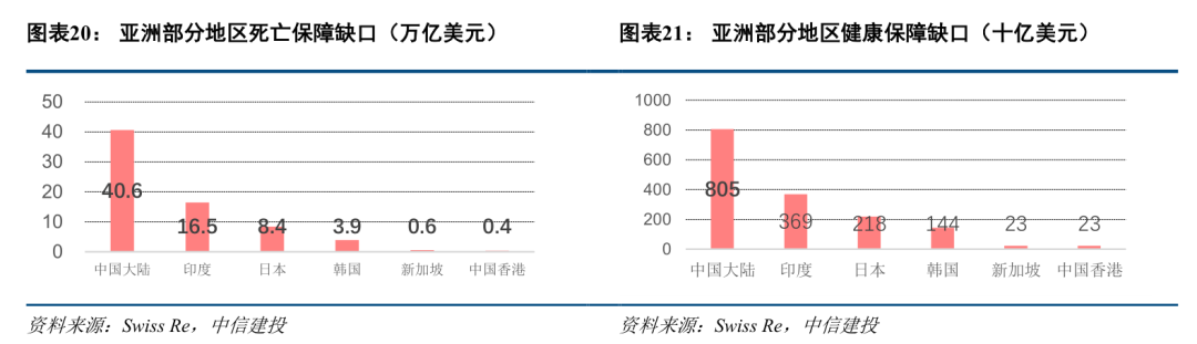 我国死亡、健康保障缺口大,寿险、人身险市场仍有充足发展空间。根据瑞再最新披露的数据,中国大陆的死亡和健康保障缺口均为亚洲第一,死亡保障缺口为40.6万亿美元、健康保障缺口为8050亿美元,均远高于其他地区。除此之外,根据瑞再测算,中国大陆死亡保障缺口2019-2030年间CAGR为4.2%,对比亚洲发达国家CAGR的-1.6%,未来死亡保障缺口将进一步扩大。逐渐扩大的保障缺口为寿险、人身险市场带来充足发展空间。