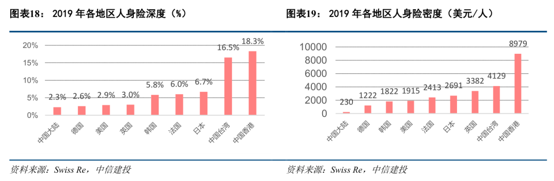 我国人身险市场深度、密度为列全球低位。根据瑞再2020年11月最新披露的全球主要人身险市场深度和密度,中国大陆当前人身险密度为230美元/人、深度为2.3%,低于全球平均水平的379美元/人、3.4%,且远低于中国香港的8979美元/人、18.3%。