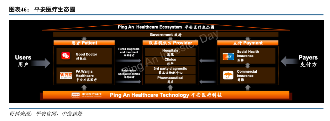 打造医疗健康生态圈。1)平安:全面构建医疗健康生态圈,为客户提供全场景服务。在平安超2.18亿金融客户中,近61%的客户同时使用医疗健康生态圈的服务。一方面,平安通过建立平安好医生、平安医疗科技两大平台,横向打通用户端、支付端和服务方;另一方面,平安通过撬动医院、医生和医药核心资源,及赋能生态圈各成员,纵向打通政府端和科技端。截止2020年末,平安合作医院数超3700家,外部签约医生21116名,控制医药流动:目前拥有6种待上市药物;120种中药生产标准;400+零售药店覆盖;赋能生态圈各成员为医疗生态圈提供品质品牌支持、渠道资源支撑、客户资源支撑和医疗科技支撑。当前已确定收购新方正集团,北大国际医院及信息技术将为平安未来的医疗产业布局构建基础支撑。