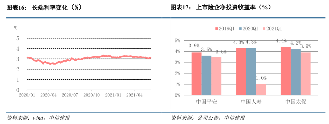 行业负债端高开低走、股价亦与之同向。人身险行业需求处于弱复苏的阶段,主要系新单增长不力所致。行业面临重疾重定义后的主力产品销售压力期,行业未来新业务价值率是否企稳受到市场质疑。财产险行业车险综改余温未退,增速承压,但将在9月以后走出压力区。投资端表现稳健:21Q1上市险企总投资收益率和综合投资收益率稳中有升。考虑到下半年我国经济增速及政策基调,及PPI向CPI的传导的不确定性,预计长端利率将继续延续震荡行情。受1Q浮盈兑现的影响,预计全年综合投资收益率仍将稳健。