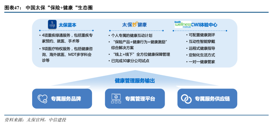 2)太保:打造“保险+健康”生态圈。面对新冠疫情带来的线上化健康服务需求激增,深化健康基础服务体系,太保蓝本的健康管理服务覆盖近 1,300 万客户,“视频医生”服务配置 200 万客户。太保妙健康提供“保险产品+健康行为+健康激励”一站式综合解决方案,提供全方位健康保障管理。CWI体验中心由太保与加拿大健康管理中心(北美首家且规模最大的通过生活方式医学进行个性化健康管理及慢性病干预服务的机构)合作建立,融合保险、大数据、健康管理与人工智能,打造健康闭环。