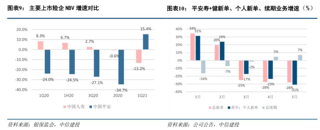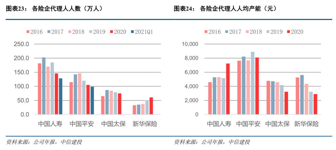 上市险企加速清虚整顿,开展专业化战略转型。平安:继续深化产能结构调整推,打造“三好五星”营业部评价体系,推进高效经营,实施代理人基本法动态调整,激发团队活力;推动银保渠道专属科技、产品、运营体系改革,预计银保渠道价值率有所提升。按照个人业务新单测算,当前代理人产能(个人业务新单/代理人数量)约17307元/月/人,较2020Q1提升36.7%,较2019Q1提升28.3%。国寿:继续坚持渠道提质稳量,严格基础管理(包括:招募、活动率、日常辅导、留存率的提升等),扎实打牢发展基础。当前个险规模128.2万(yoy-35.9%),而新单增速仅yoy-6.4%,新单增速约等于产能增速+人力增速,测算个险人均产能大幅提升,预计为30%以上。公司将继续聚焦队伍建设4.0以巩固队伍质态,并将在半年报披露产能改革成果。太保:全力打造“长航”新引擎,进一步聚焦代理人队伍内质提升和产能升级,以服务增值和科技赋能打造新动能,强化绩优牵引,搭建多层次客群服务生态体系。