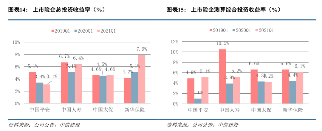 得益于1Q21股票市场的较好表现,上市险企总投资收益率和综合投资收益率表现优异。总投资收益率:新华7.9%(yoy+2.8pct)>国寿6.4%(yoy+1.3pct)>太保4.6%(yoy+0.1pct)>平安3.1%(yoy-0.3pct)。如加回华夏幸福182亿减值损失,测算平安总投资收益率5.5%(yoy+2.1pct),表现依然稳健。