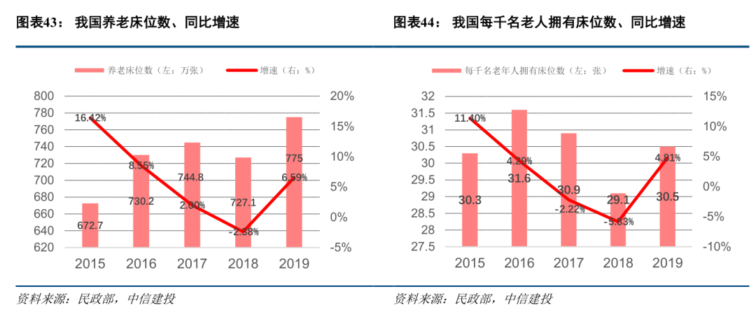 庞大的人口及中产阶级人群,为我国商业保险的发展提供了沃土。而我国医疗养老体系仍然存在诸多痛点,为商业保险预留的“处女地”。以养老床位数看:截止2019年末,我国共拥有775万张床位,平均每千名老年人拥有30.5张床位。15年-18年增速逐年下降,19年稍有回升,但平均每千名老年人拥有床位数仍有所不足。根据OECD2017年公布的数据,OECD33个国家平均每千名老年人拥有床位数为47.2张。