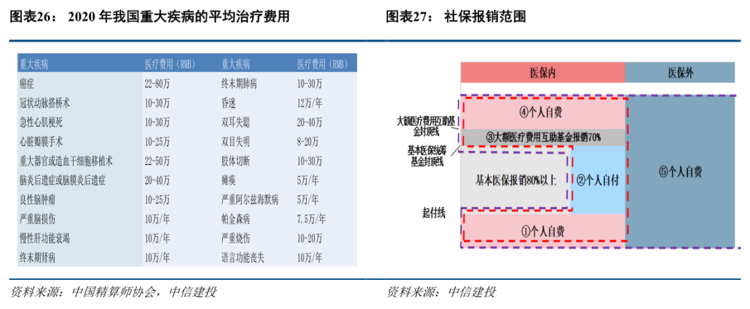 当前社保对于重大疾病的住院治疗负担比例有限。虽然我国居民的医保账户覆盖率为95%,但仅包括医保目录内的药品(甲类、乙类),惠民保也仅能覆盖少量医保目录外的用药(如京惠保,覆盖17种医保目录外药品)。同时,医保基金、大额医疗互助金均已设置封顶线,个人仍需自己承担超过封顶线的部分。以北京的城镇职工医保为例,社保住院保额为当地职工平均工资的4倍,超过医保基金保额的部分,大额医疗互助基金将负担70%、个人负担30%,且大额医疗互助基金年内累计最高支付数额为10万。以2019年北京城镇职工平均工资测算,个人的重大疾病治疗费用最多可从社保获得50万的赔付,推算个人需负担的最低住院费用为15.3万,超过了当年当地城镇职工约10万的税前年收入水平。重疾治疗产生的误工费、及重疾治疗后的术后康复管理,或希望获得的更高水平诊疗及社保外用药的人群,依然负担较重。商业重疾险依然有较大的需求缺口。