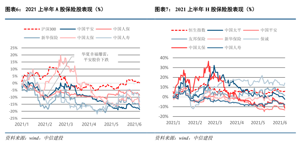 相较A股保险股,H股股价分化更为明显。2月H股保险板块迎来一次大幅度上涨,但3月以来除保诚外其他险企均震荡走跌。除了大环境的改善利好和低基数效应,香港市场机构投资者占主体,对企业的评估相对更加理性客观。友邦股价上涨的主引擎为亚太地区多元布局尤其加大了内地业务的资源倾斜。从港市保险个股来看,截止2021年6月11日,保诚、友邦、太平、人寿、新华、太保和平安的累计涨跌幅分别为14.3%、1.6%、-2.4%、-8.1%、-11.5%和-13.2%。