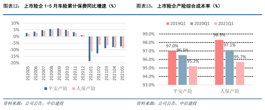 产险行业受车险综改的影响、增速承压,但将在9月以后走出压力区。2021年1-4月产险公司累计保费同比增速分别为0.1%、6.1%、5.8%、3.7%。银保监会在Q1行业情况发布会上表示,行业车均保费降幅20%,车险保费增速因此承压,1-4月累计增速分别为-12.8%、-7.4%、-6.2%、-6.9%;而非车险增速呈现2位数高增态势、截止4月底,车险保费占比仅50.2%,自年初以来下降10.2%;与之相反,非车占比提升10.2%至45.2%。上市险企车险增速下滑:平安产险、人保产险的车险1-5月累计增速分别为-7.5%、-8.9%。考虑到基数效应,预计车险保费增速在今年9月后压力将大幅缓解,龙头险企综合成本率优于行业,而在车险市场加速出清的趋势下,上市险企将愈加强者恒强。
