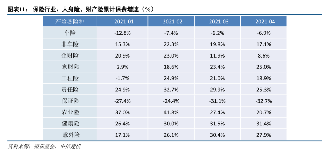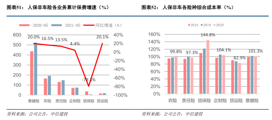 意外健康险、农险、责任险发展空间充足,险企加大布局力度。21年1-4月保险行业健康险、意外险、农险、责任险累计保费分别同比增长31.4%、27.9%、20.7%和25.3%,在全部非车财险中增速较高。以人保为例,21 年1-5月意健险、农险、责任险累计保费分别同比增长20.0%、16.5%、13.5%;意健险方面,人保财险继续服务“健康中国”战略,加强集中化、精细化的承保管控,上线健康险智能风控平台;加强理赔质量管控,实施风险减量管理;农险方面,立足深化农业供给侧结构性改革,一方面推进传统业务提标、 扩面,持续提高农业保险保障力度;另一方面加大产品创新力度,不断发展地方特色性业务 新兴业务领域突破发展;