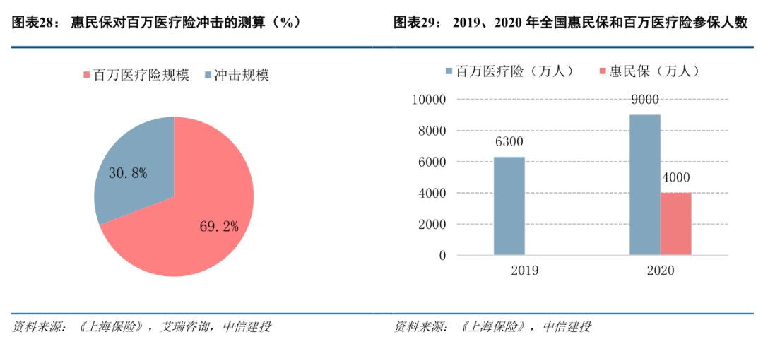 打造多层次的健康险体系将成为破局之道。惠民保的推出顺应了对于过往供给型模式下,所忽视的下沉市场的重疾险保障需求。惠民保、长期医疗险的推出、及高速发展是历史的必然。 2020年是惠民保发展元年,2020年6月-2021年5月期间,全国21个省份81个城市共上线了117款惠民保产品。短期看,惠民保对百万医疗险存在一定冲击。由于惠民保主要参保人群(18-60岁)年龄与百万医疗险(一般要求60岁以下)重合,据北京京惠保数据披露,18-60岁参保人群占比57.6%。经测算,惠民保对百万医疗险冲击率为30.8%。长期看,惠民保和百万医疗险的互补作用将大于替代作用。因二者的主要购买人群有重合,形成了短期的替代效应,但随着二者的保障程度、范畴的逐渐明晰,我们预期二者将共同推动整个医疗保险市场的发展,两者的参保人数都将逐年增长。从数据来看,2019年百万医疗险投保人数达 6300万人,虽然2020年惠民保参保人数超4000万,但医疗险意识的普及、百万医疗险2020年投保人突破9000万人(较2019年投保人数提升42.9%)。