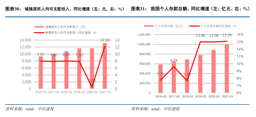 财富管理时代背景下,具备保障属性的、长久期的储蓄类保险产品具有不可替代性。21年3月我国城镇居民可支配收入增速明显回升、个人存款总额逐年攀升。2018年资管新规打破刚兑,与主流的非保本类理财产品相比,长期储蓄类保险产品具有收益确定性强的特点,叠加久期较长的属性,在供给上具有独特优势。