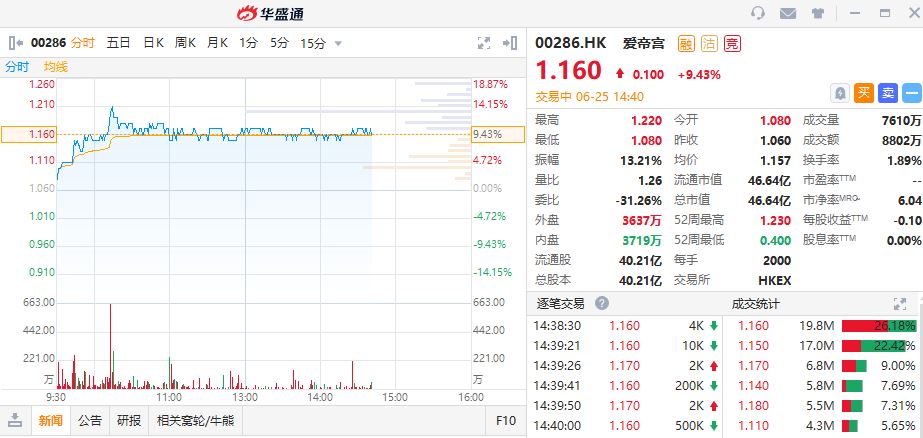 华盛资讯6月25日消息,爱帝宫今日强势上涨,截止发稿,爱帝宫上涨9.43%,现报每股1.16港元,总市值46.64亿港元,成交额8802万港元,换手率1.89%。