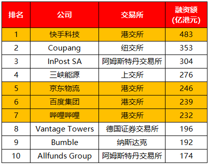 2021上半年,港股市场IPO融资规模达到2097亿港元,仅次于纳斯达克和纽约证券交易所,位列全球第三。全球前10大新股融资额同比增长32%,而其中有4只新股均来自香港,包括:快手科技(01024.HK)融资483亿港元、京东物流(02618.HK)融资246亿港元、百度集团(09888.HK)融资239亿港元、哔哩哔哩(09626.HK)融资232亿港元。