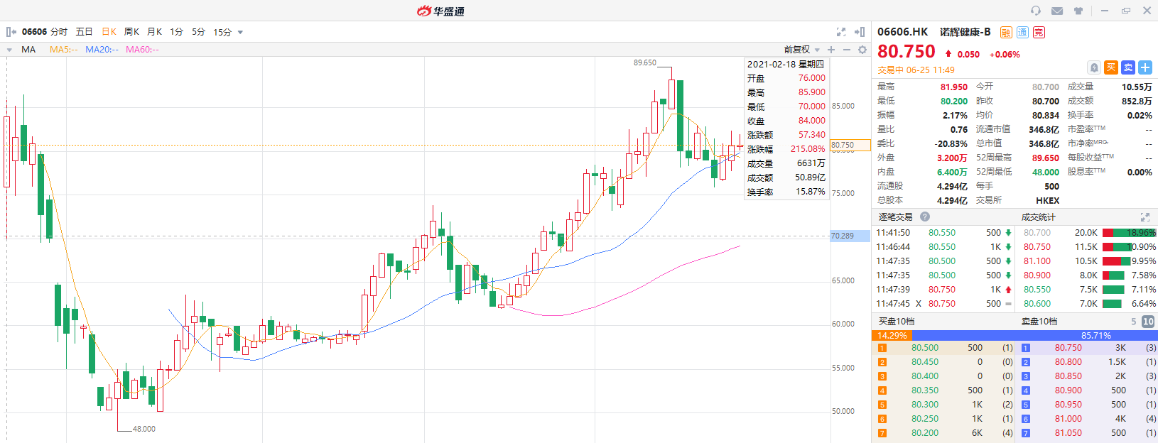 人气爆棚的诺辉健康,在上市首日开盘即上涨185%,最终收盘仍录得大幅收涨215%的优异表现,让打新的投资者赚得盆满钵满。尽管此后股价有明显的回撤,但企稳后再次开启上涨。近期股价创出了历史新高,距离低点上涨将近60%。