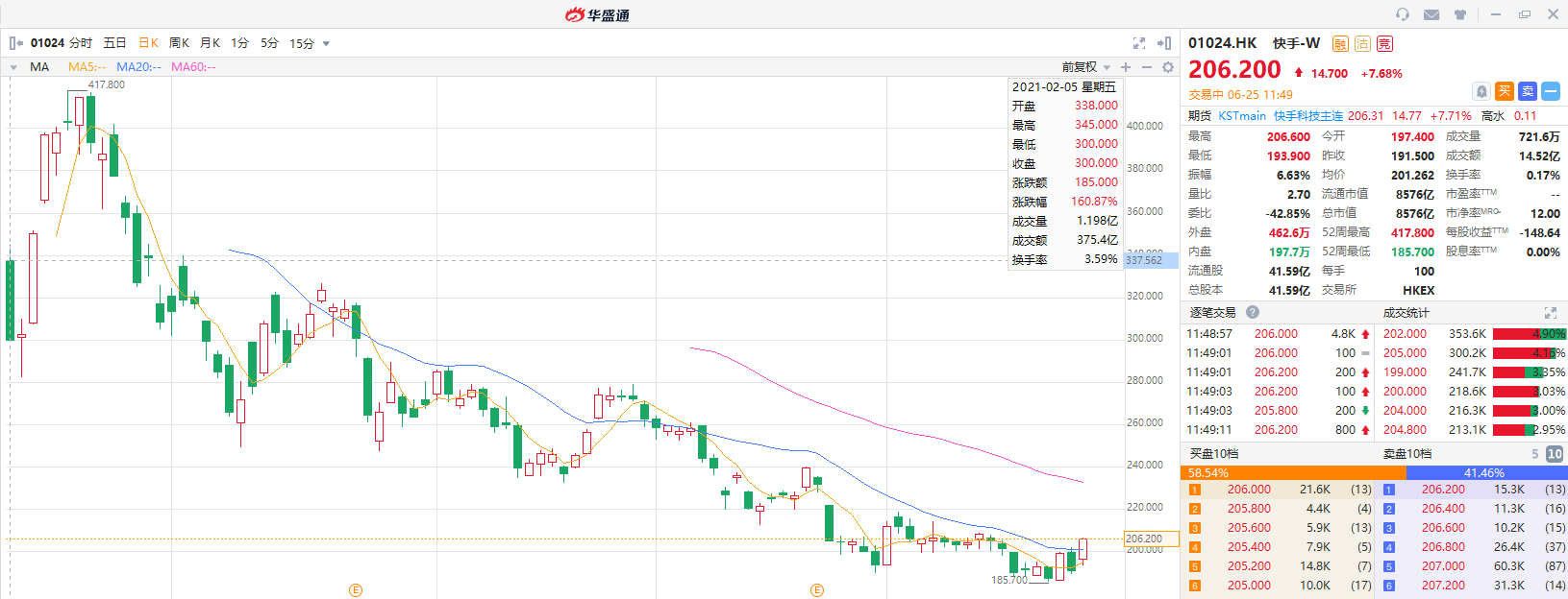 上市首日,快手的火爆在股价走势上暴露无遗:开盘即报338港元,涨幅高达194%!全日快手成交额高达375亿港元,最终收盘仍录得161%的涨幅,一手稳赚18500港元。随后几日,快手人气不减,最高冲至418港元附近,市值一度高达1.7万亿港元,仅次于腾讯、阿里、美团和工商银行。