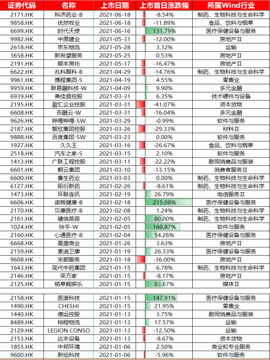 与去年同期相比,2021年上半年香港上市新股总计46只,同比减少22%。但总融资额度上涨逾1倍,众多明星股的二次上市、同股不同权架构新股上市进一步激发了市场活力。金融服务、科技、传媒以及消费行业等众多新经济公司上市数量明显增加。江山代有才人出,各领风骚数百年。接下来我们就先来盘点一下上半年那些“风骚”的新股吧!