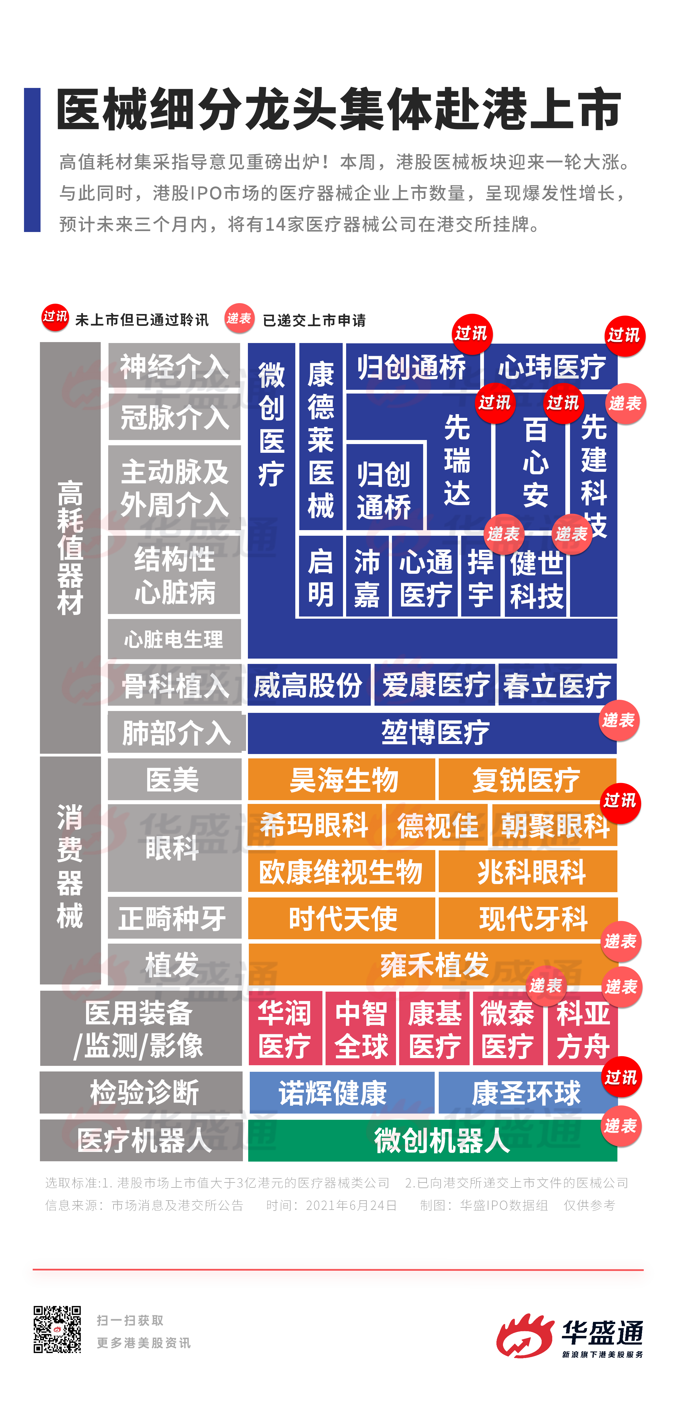 上半年,医疗相关概念的新股如医渡科技、诺辉健康、时代天使,统统都成了首日涨幅超100%的“大肉签”。而近期,医疗器械细分龙头股集体赴港上市,为下半年拉开轰轰烈烈的大幕。具体请参看下面的一图: