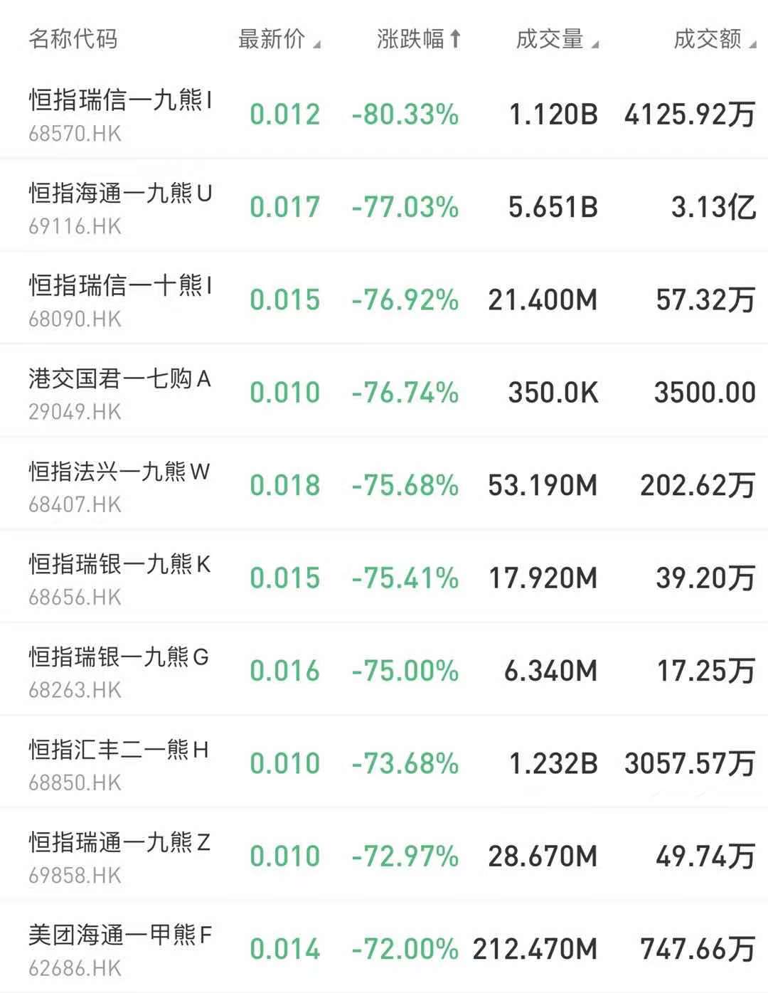在今日跌幅榜中,恒指瑞信—九熊I跌80.33%;恒指海通—九熊U跌77.03%。