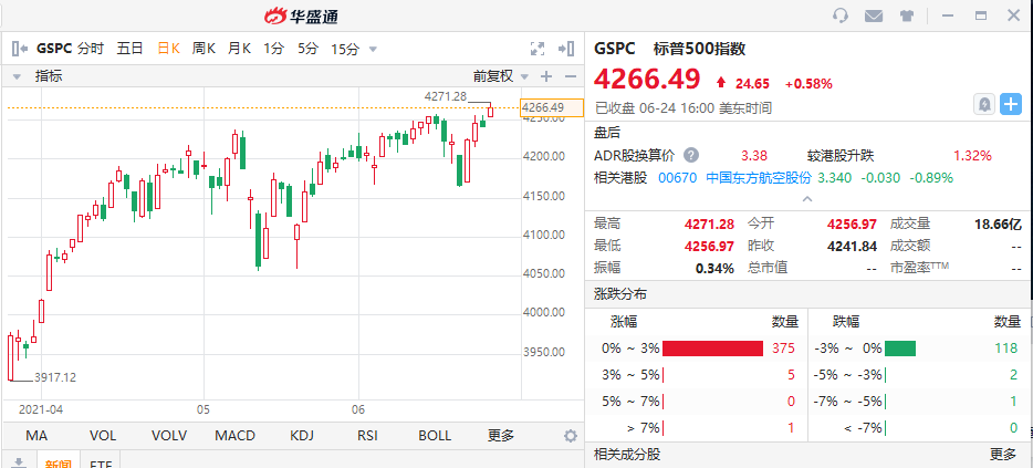 标普500指数周四收涨近0.6%,收于创纪录的4,266.49点,这是6月14日以来的最高点。巴克莱银行预测标普500指数今年年底甚至会更高,达到4400点。