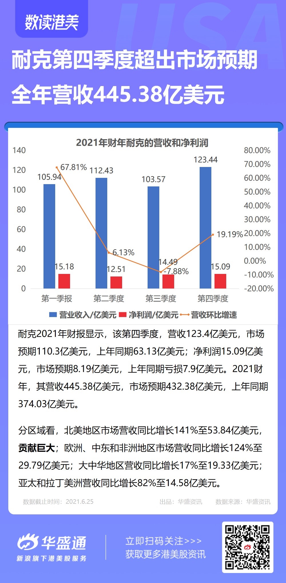 6月25日,耐克公布2021年的财报(注:耐克财年为每年的6月1日至第二年的5月31日,最新披露财报所属2021财年)数据显示,第四季度营收123.4亿美元,市场预期110.3亿美元,上年同期63.13亿美元;净利润15.09亿美元,市场预期8.19亿美元,上年同期亏损7.9亿美元。2021财年,其营收445.38亿美元,市场预期432.38亿美元,上年同期374.03亿美元。