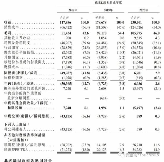敦煌网2018年、2019年、2020年经调整EBIDA分别为-2122万美元、2912万美元、3428万美元,经调整EBIDA率分别为-18%、16.3%、14.9%。