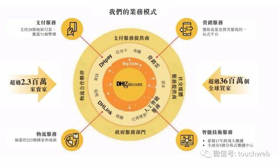 以电商平台为中心,敦煌网提供了一套技术支持的数字服务,可广泛满足生态系统中每个参与者的需求,主要业务线包括:
