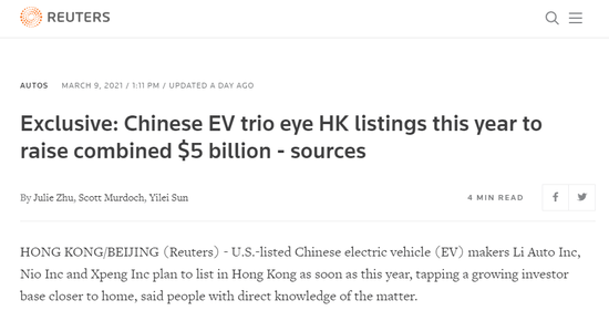 距离小鹏汽车赴美上市仅半年多,2021年3月,市场就传出了蔚小理即将回港上市的消息。