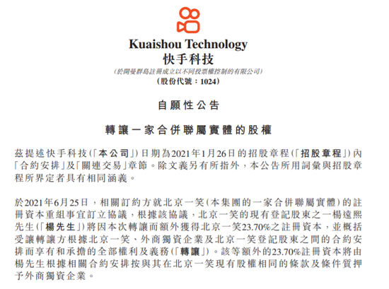 快手-W(01024.HK)发布公告,于2021年6月25日,相关订约方就北京一笑(集团的一家合并联属实体)的注册资本重组事宜订立协议,根据该协议,北京一笑的现有登记股东之一杨远熙先生将因本次转让而额外获得北京一笑23.70%的注册资本,并概括受让转让方根据北京一笑、外商独资企业及北京一笑登记股东之间的合约安排而享有和承担的全部权利及义务。该等额外的23.70%注册资本将由杨先生根据相关合约安排按与其在北京一笑现有股权相同的条款及条件质押予外商独资企业。