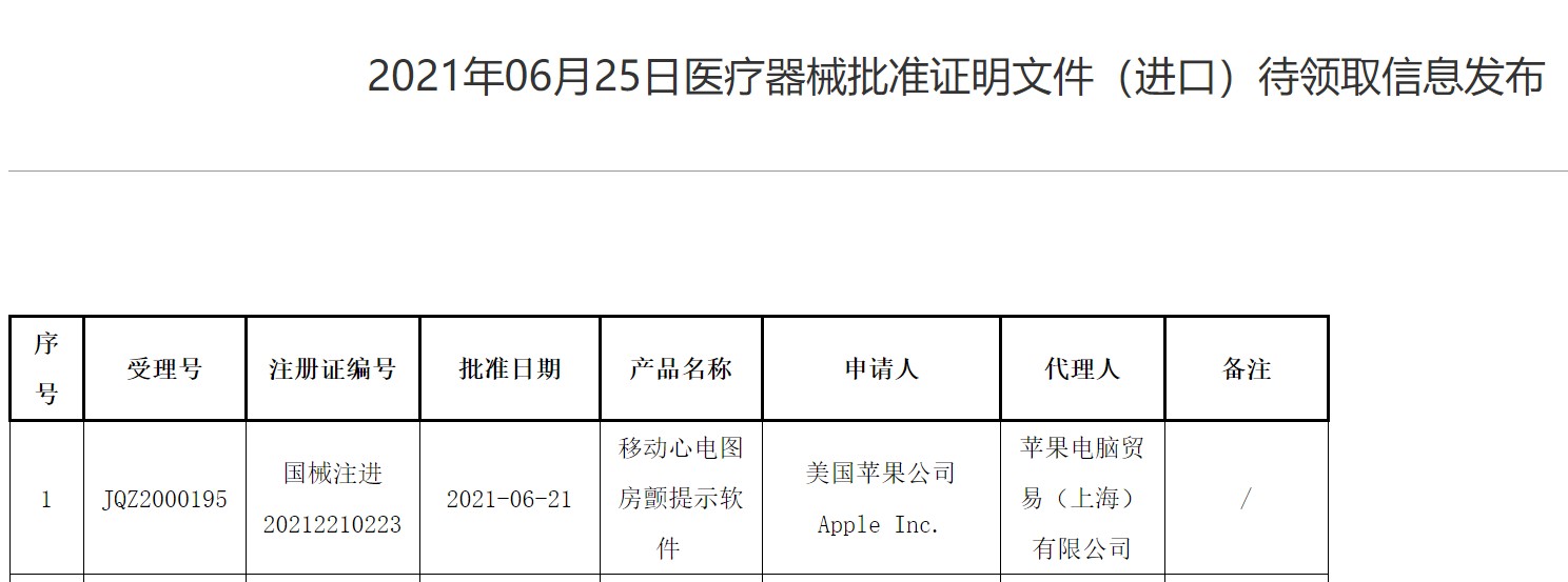 据国家药品监督管理局网站显示,6月25日医疗器械批准证明文件(进口)待领取信息,其中第一项是苹果公司(AAPL.US)的移动心电图房颤提示软件,注册证编号为国械注进20212210223。