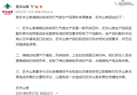 “气泡水原料来自日本福岛”?农夫山泉否认,并要求媒体删文