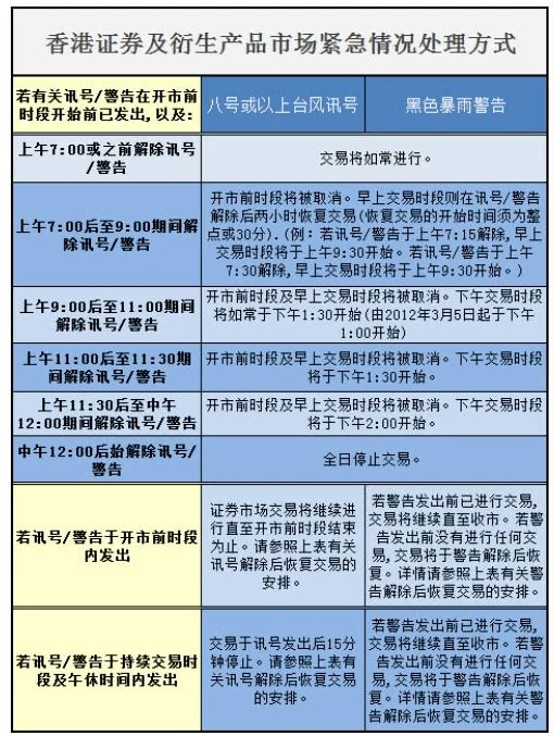 港交所称,天文台发出黑色暴雨警告,若早上9点仍不能取消天文台发出的黑色暴雨警告,将取消盘前交易。港交所关于市场紧急情况处理规定归纳如下表: