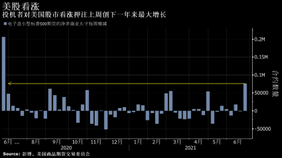 随着标普500指数迈向有纪录以来最佳上半年度表现,投机者对美国股市看涨押注上周创下一年来最大增长。根据美国商品期货交易委员会的最新数据,电子盘小型标普500期货的净非商业头寸上周增加近76,000份合约,为2020年6月以来最多。在两党就拜登基础设施计划达成初步协议,鼓舞经济复苏的乐观预期后,美国股市上周收在纪录高位。