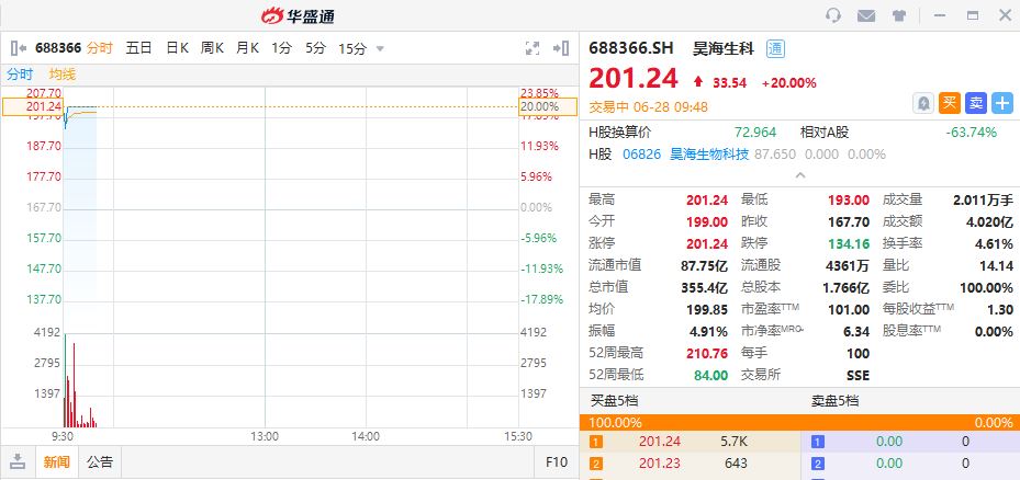 华盛资讯6月28日消息,6月25日晚,昊海生科发布2021年半年度业绩预告,经财务部门初步测算,昊海生科预计2021年半年度实现净利润为2.2亿元-2.5亿元,与上年同期相比,将增加1.92亿元-2.22亿元,同比增长699.21%-808.19%。受消息刺激,昊海生科A股大涨,截止发稿,昊海生科大涨20.00%涨停,报每股201.24元,总市值355.4亿元,成交额4.020亿元,换手率4.61%。该股H股上周五收涨8.21%。