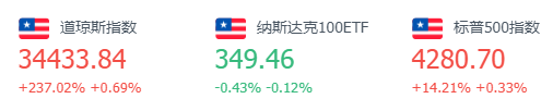 截至收盘,道指涨237.02点,或0.69%,报34433.84点;纳指跌9.32点,或0.06%,报14360.39点;标普500指数涨14.21点,或0.33%,报4280.70点。