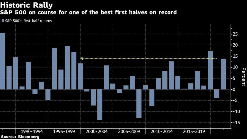据彭博社报道,六个月前,人们已经对高估值的股市感到担忧。但如今标准普尔500指数一路高歌猛进,有望创下有史以来最好的上半年涨幅。