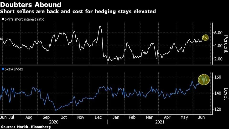 在股市上涨和1月的空头紧缩中几乎被逼入绝境的卖空者正在观望入场。根据IHS Markit的数据,标普500指数的空头权益占流通股比例从不到2%攀升至7%。与此同时,期权市场对未来几个月损失的保护需求正在上升。