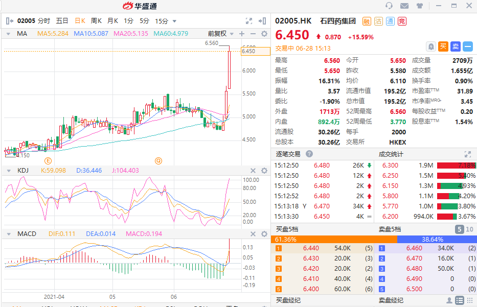 华盛资讯6月28日消息,石四药集团今日持续走高,盘中一度涨超16%,刷新16个月以来新高;截至发稿,该股涨15.59%,报6.45港元每股,最新总市值195.2亿港元,三个交易日累计大涨36%。