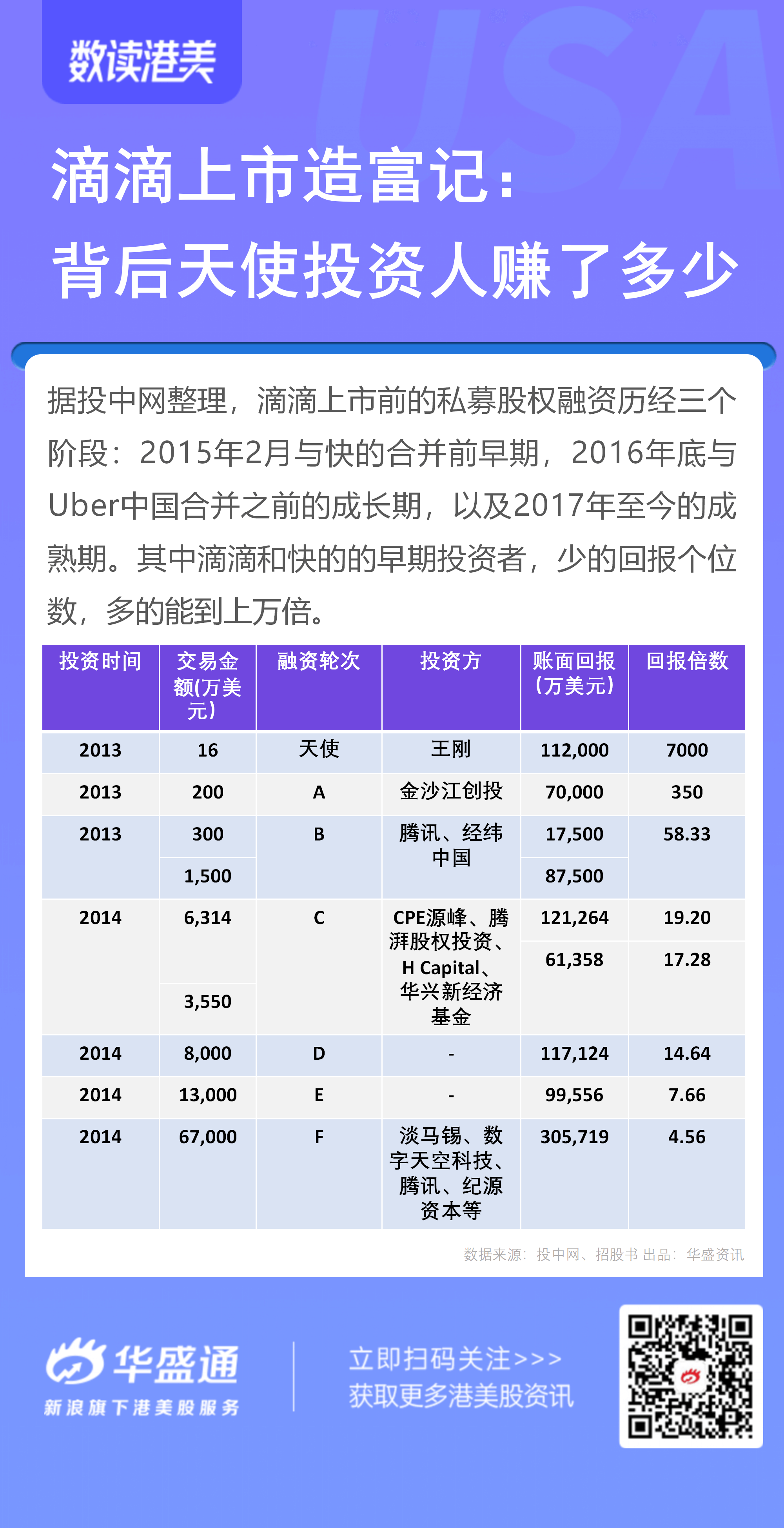 另外,从数据来看,滴滴上市的造富神话中,除了王刚,参与滴滴A轮投资的金沙江创投,回报倍数超过350倍;2013年投资1500万美元的腾讯、经纬,回报约60倍。此后的C轮、D轮投资者,回报则在5-20倍不等。