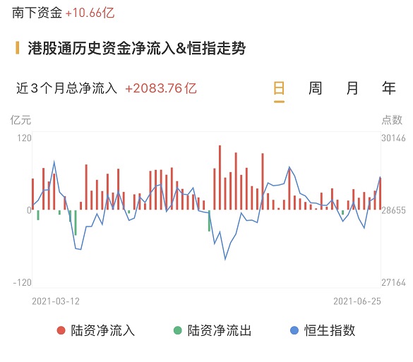 南下资金今日净流入港股高达10.66亿港元,上周五为净流入超29亿港元。