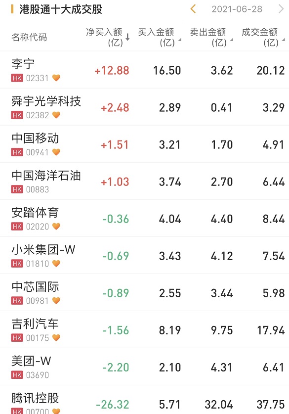 个股方面,今日南下资金净买入李宁12.88亿港元,为今日买入之最。此外,南下资金净买入舜宇光学科技2.48亿港元,净买入中国移动1.51亿港元。